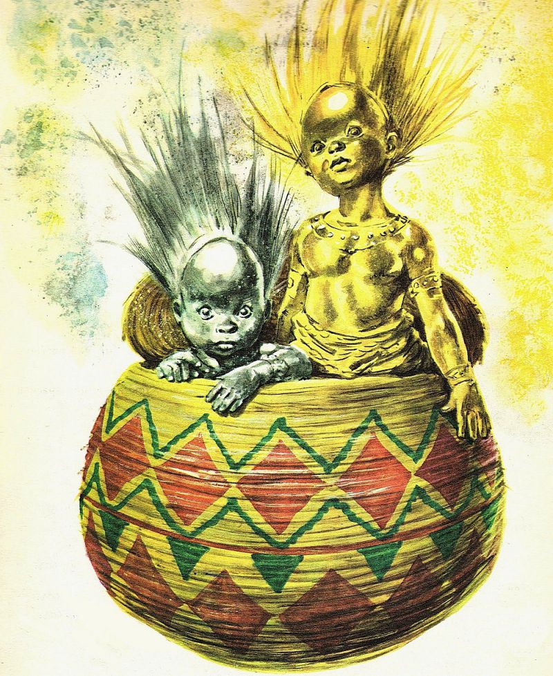 Можете ли да си представите какво изпитал Ниаме, когато вместо златно момче намерил две едри жаби. Той заповядал да убият тези грозни животинчета, а нещастната си жена изгонил от своя дом, като я оставил да живее в най-затънтеното място на владенията си, при белите облаци чак.