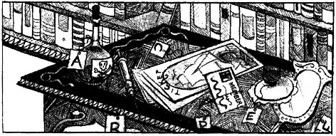 Тя прекоси тържествуващо Вивариума с влечугите до дъното, където все още бяха струпани на купчина книгите, в които Клаус бе чел за Мамбата на злото. Другите я последваха по пътеките между редовете влечуги. Без да продума, тя подреди предметите в редица върху масата — стъкленото шишенце със запечатаната гумена запушалка, спринцовката с острата игла, малката връзка сгънати листове, ламинираната карта, пухчето за пудра и ръчното огледалце.