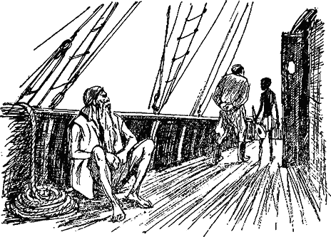 Двама матроси, голи до кръста, свободни от вахта, играеха карти под сянката на платната. Край тях боцманът Никита Степанич, червенокос старец с малки подвижни очички и сиво пашкулче на брадата, чистеше нова, къса драгунска винтовка. Той си тананикаше някаква песничка. Често поставяше винтовката пред себе си, гледаше блясъка на стругованата стомана и явно се наслаждаваше на оръжието. Вземаше го, притваряше едното си око и гледаше в цевта срещу слънцето. Равният му, малко пресипнал глас шуртеше като вода, която се промушва из гъста тръстика:
