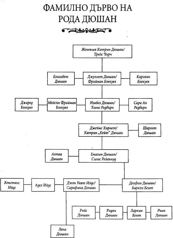 Лив разтвори два големи листа на масата, които веднага разпознах. Фамилните родословия на Дюшан и Рейвънуд.