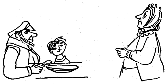 — Спри, защото ще ми се отяде и граховата супа, и чудото — извика Горна баба. — Така на човек му се преобръща яденето в стомаха! И изобщо, вече не желая да чувам по време на ядене нищо, свързано със стихове! Изпразвай си чинията, Бой, иначе няма да получиш пудинг със сироп.