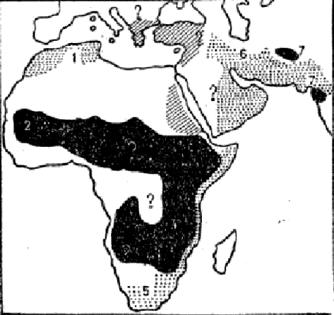 Карта на разпространението на подвидовете лъвове в Африка и Азия. Измрели подвидове: 1 — берберски лъв; 2 — капски лъв