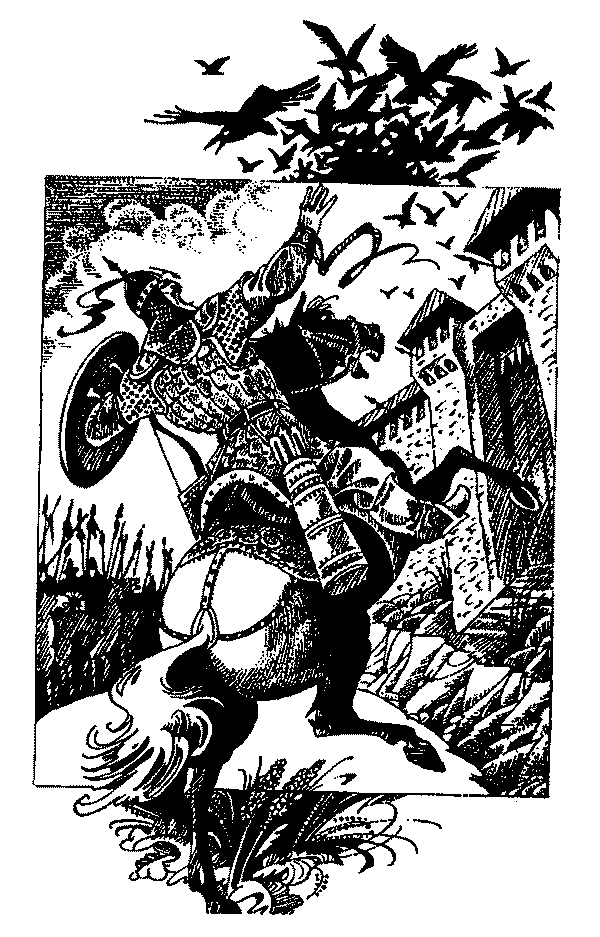 По команда на Илбарис мергените обтегнаха лъкове и няколко човека паднаха от високата стена в тревата. Колоната на конниците се понесе край рова и когато достигна до края, двете половинки на стотната размениха местата си. От стената също полетяха стрели, един от алипите на Ташбулат беше ранен в ръката. Под друг падна коня, но той се премести на резервния, който всеки воин винаги води със себе си. Адай, яздещ отзад, извика иззад гърба на Илбарис: