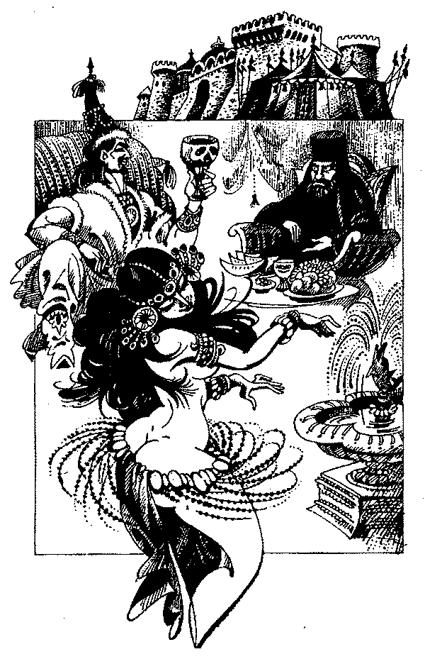 Хаганът си наливаше чаша след чаша, изпращаше и на гостите… Музиката ставаше все по-оглушителна, смях избухваше в различни краища на масата, девойките от време на време присядаха до този или онзи от гостите, прегръщаха го, смееха се, отвеждаха го със себе си. От изпитото на Йоан Фасиан му се виеше свят, сетивата му се изостриха, в ушите му звънтеше. Той вече не разбираше добре къде е и какво се случва. Една от танцьорките се притисна към него, той видя яркочервените й устни, косите й с цвят на узряла ръж, сините очи и бенката на лявата й гръд. Девойката бе пияна, от нея се носеше ухание на цветя, тя му протягаше чаша с вино.