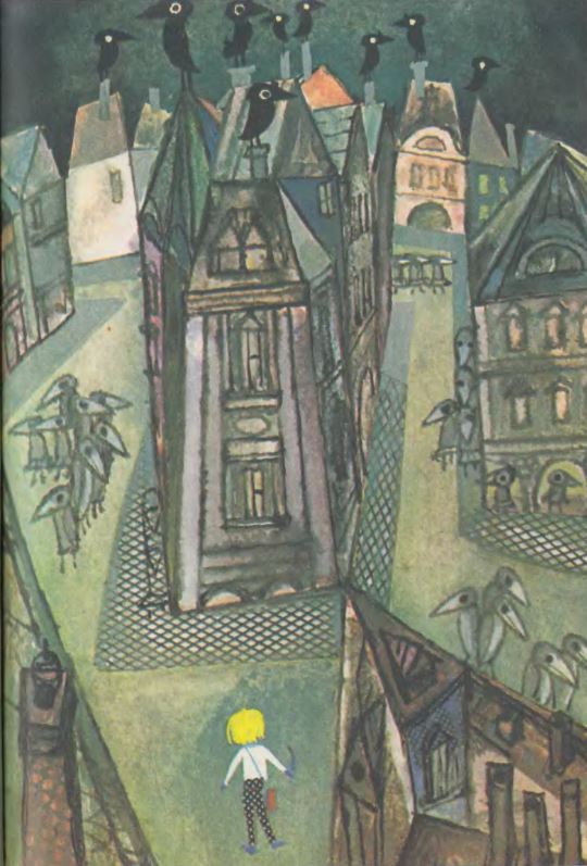 Той навлезе в града. Картината стана още по-еднообразна и нерадостна. Сивите къщи се редяха еднакви на височина; квадратните им прозорчета по нищо не се различаваха едно от друго. Еднакви сиви птици се качваха в еднакви сиви автомобили и ги подкарваха.