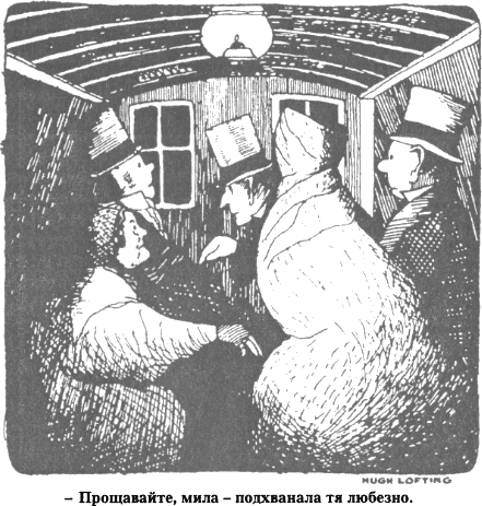 — Да — отвърнал Джон Дулитъл. — Обаче ние не чакаме този. Това е бързият за Туинбъро — една зелена и една бяла светлина. Нашият има две бели светлини отпред. Отстъпи малко в сянката на плета. И не тъпчи по наметката. Ще я окаляш.