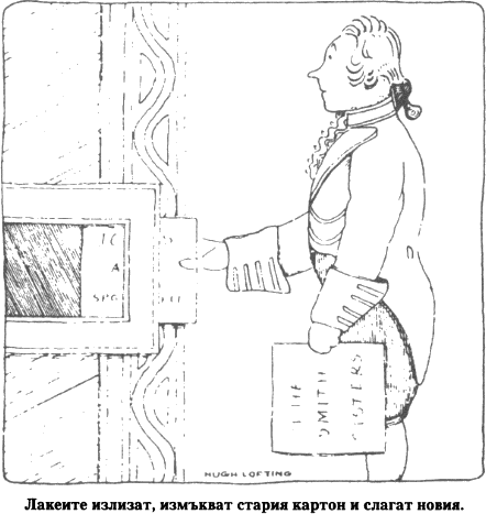 — Но за това трябват двама — обяснил му докторът. — Нали виждаш какво правят лакеите — все едно че са войници. Излизат в маршова стъпка, всеки с картон в ръка, и като на учение тръгват към двете страни на сцената, измъкват стария картон и слагат на мястото му новия.