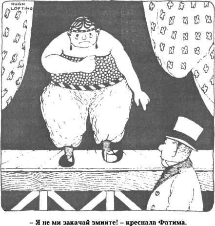 След това Блосъм предложил да им покаже следващата забележителност, принцеса Фатима, укротителката на змии. И ги извел от задушната, вмирисана менажерия — навън, на чист въздух. Докторът преминал край редицата от клетки свел глава, свъсил умърлушено вежди. Защото различните животни, познавайки прочутия Джон Дулитъл, до едно му правели знаци да спре да си поприказват.