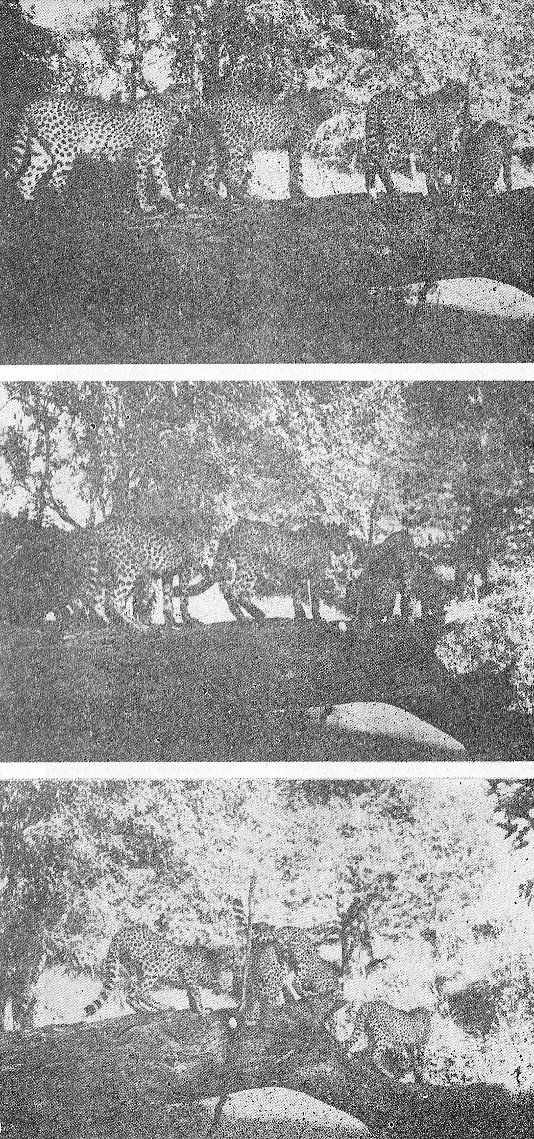Отново загубихме младите гепарди в продължение на няколко дни, но после ги намерихме отвъд Леопардовата скала — на 15 мили от мястото, където ги бяхме видели последния път. Очевидно те бяха прогонени от лъвовете, които на няколко пъти срещнахме. Участниците в една ловна експедиция ни бяха дали малко месо от слон и ние го предложихме на гепардите. Сомба и Тайни вдигнаха високо носовете си, но Биг Бой с апетит яде жилавото месо до претъпкване. Два дни по-късно ми дадоха биволско месо, което гепардите обичаха и бързо изядоха до последното парченце, като всеки гледаше да издърпа за себе си колкото може повече.