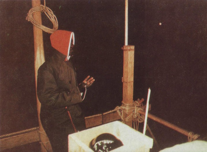 На 15 юли бурята достигна връхната си точка. Платното не беше повече в състояние да издържи поривите на халата, която го шибаше така безпощадно, че обикновена гемия би се обърнала непременно. Смъкнахме ветрилото под грохота на гръмотевиците. Святкаше се и валеше. Когато свалихме платното, мачтата със смешната си стълба остана да стърчи самотна и се залюля към бляскащите мълнии като гол скелет. Без ветрилото лодката изглеждаше ужасно пуста и безжизнена. Щом намаля скоростта, увеличи се настъплението на вълните. Остатъкът от кухнята изчезна в морето. Известно време в краката на Карло се въртяха черупки от яйца и късчета вар, защото се счупи една делва. Все пак предната палуба и левият борд бяха пълни с храна в завързаните делви с плътни запушалки. На мачтовата стълба висяха суджуци и пушени свински бутове. По-неприятно от жълтъците на яйцата беше появата на няколко „португалски галери“ по палубата. Със своите изгарящи пипала те се увиваха във всичко. Настъпих един мехур, ала не пострадах. Но около краката на Жорж и Абдулах се усукаха парещи пипала, когато работеха във вода до кръста, за да прекарат нови въжета на мястото на скъсаните. И двамата бяха основно измити с импровизираното естествено лекарство на Юри. Абдулах отричаше, че изпитва болка. Ала на ръката му имаше кръгли белези от зараснали рани, които сам си беше нанесъл, опирайки до кожата запалена цигара, за да докаже, че мъжете от Чад са безчувствени към болките.