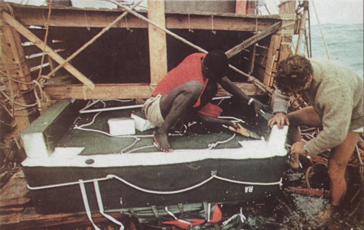 Докато Нормън се залисваше с копчетата и слушалките, а ние се редувахме да въртим ръчката на генератора, дойде Карло и ни поднесе вкусни и превкусни студени ястия. Извини се, че кухнята не работела така образцово както преди, защото всички тенджери били отплавали зад борда, примусът пък не можел да бъде запален, понеже лежал на морското дъно. Но ако желаехме, можехме да получим пушен свински бут или египетски хайвер, ножът му бил на разположение. Не се предвиждаха никакви дажби и за египетския „мумиев хляб“, който беше рядко вкусен, независимо дали го мажехме с берберско масло и мед, или с пиперлия овче сирене в зехтин. Ураганът беше пощадил делвите с хранителни припаси, поставени на меката папирусова палуба. Пострадали бяха главно дървените сандъци. Папирусът и въжетата, делвите и меховете, кошовете и бамбукът бяха издържали. Изобщо най-уязвим в двубоя със стихиите се беше оказал дървеният материал.