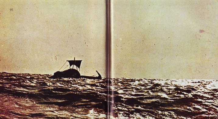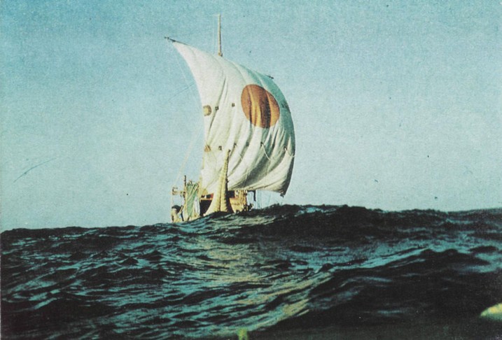 Зададе се вълна откъм дясната страна, тя се надигна, плъзна се спокойно по брезента и се изля извън борда. До предната палуба стигнаха само няколко пръски, платното отклони водопада. Юри се разположи победоносно на птичия кафез, приспособен за маса, и взе да се храни, а останалите при мачтовата стълба с чинии в ръце се изблещиха, когато видяха, че отмина омаломощена и следната вълна, и по-следната. Седяхме и зяпахме магьосника, който беше сполучил да обуздае стихиите с един парцал. Тайната му се криеше в обстоятелството, че папирусовата опашка умъртвяваше тласъка на вълната, разцепваше я на две и само профилът на водната стена се изливаше надлъжно от двете страни на лодката, затова брезентът я отклоняваше лесно.