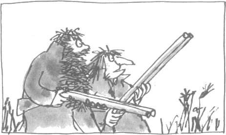 Птиците отлетяха моментално обратно на покрива на къщата. Маймунките изтичаха в клетката си и се подредиха с главите надолу една върху друга. Само миг по-късно господин и госпожа Тъпашки влязоха с тежки стъпки в градината. Всеки от двамата носеше по една страховита на вид пушка.