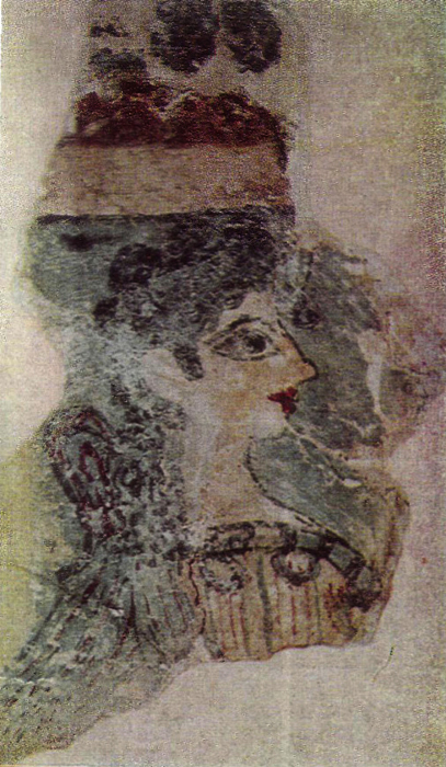 21. Женска глава, т.нар. „Парижанка“. Фрагмент от фреска в парадната зала на Кносоския дворец, около 1500 — 1450 г. пр.н.е.