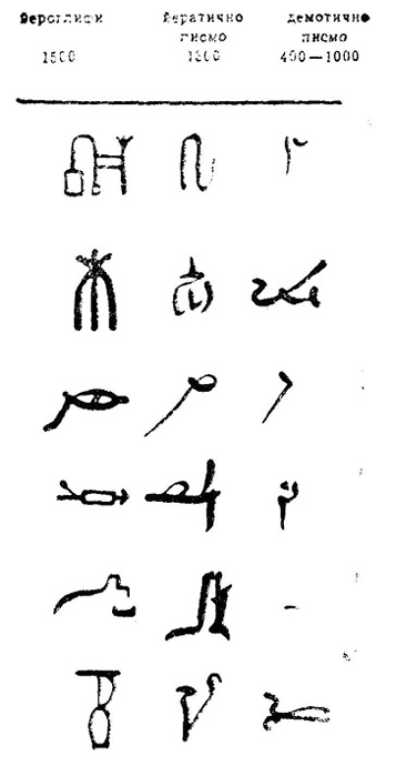 Рис. 12. Няколко примера, които показват как вече значително развитите йероглифи преминали в йератично, а по-късно и в демотично писмо.
