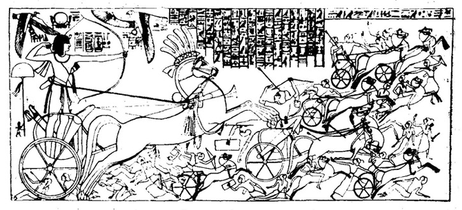 Рис. 14. Сети I в бой срещу петите в Сирия. Изображение от храм в Тива, което някога е било цялото оцветено, включително и надписите. Белцони, който на времето открил гробницата на Сети, намерил само следи от оцветяването.