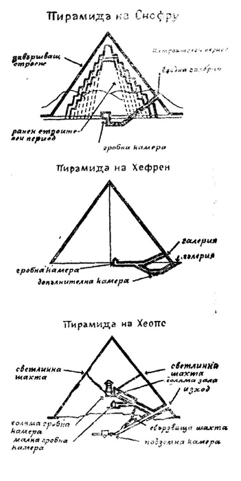 Днес трамвай №14 ни отвежда почти до самата пирамида, където ни посрещат с викове разводачи, магаретари и камилари, настояващи за бакшиш. Заглъхнали са стоновете на робите, нилският вятър е отнесъл свистенето на бичовете, разнесла се е миризмата на проляна пот. Останало е само огромното дело. Само едно ли? Не, много — защото изкачим ли се на Хеопсовата пирамида (най-голямата и най-високата) и погледнем на юг (вляво лежи сфинксът, вдясно втората и третата пирамида — Хефреновата и Микериновата), ще видим в далечината друга група гигантски фараонови гробници: пирамидите на Абузир, Сахара и Дашур. От много други са останали само развалини. Пирамидата в Абу-Роаш е толкова разрушена, че сега от горе може да се види гробната камера, скрита някога под хиляди тонове камъни. Пирамидата в Хавара (в чиито затлачени от тиня коридори през 1889 г. Питри проследявал дирите на крадците) и пирамидата в Илахун, изградена от непечени нилски тухли около скални ядра, били разрушени от атмосферните влияния. А „лъжливата“ пирамида при Бедум (наречена от арабите „Ел-харам ел-Кадаб“, защото им се виждала съвсем различна от останалите), която представлявала най-удобна цел за разрушителните стихии, за ветровете и навявания от тях пясък, тъй като никога не била довършена, и днес още се издига на четиридесет метра височина. Пирамиди от най-стари времена до епохата на етиопските владетели от Мерое — само северната група в полето на Мерое наброява четиридесет и една такива пирамиди, в които почиват тридесет и четири фараона, пет царици и двама престолонаследника! Пирамиди, строени с кръв, пот и сълзи. Гробници на единици, на богоизбрани, които заставяли стотици и стотици хиляди безименни да увековечават техните имена с устремени към небето каменни паметници! Само за слава ли? Само от стремеж към монументална каменна изява ли? Или само заради безграничната гордост на могъщите, загубили чувството за мярка на обикновените смъртни?