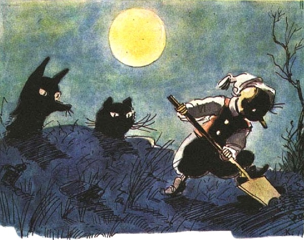 Лиса мъкнеше Буратино по улицата. Те видяха в лунната светлина над тротоара да се разхождат сити котараци със златни очила, под ръка с котки, които имаха на главите си шапки.