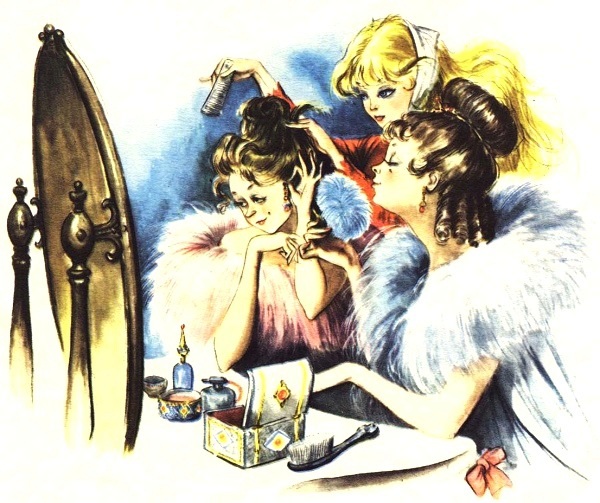 Повикали добра коафьорка, която да подреди буклите им в две редици, и купили бенки от най-добрата майсторка. Повикали и Пепеляшка, за да чуят и нейното мнение, защото тя имала добър вкус. Пепеляшка им дала най-добри съвети и дори предложила тя да ги среши. Сестрите на драго сърце приели. Докато ги решела, те й говорели: