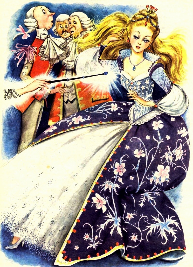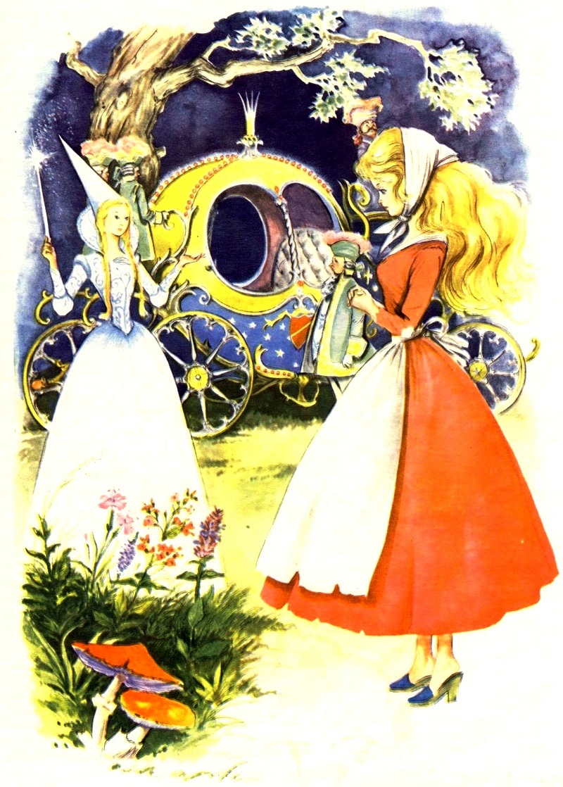 Вълшебницата й поръчала да стои само до полунощ и я предупредила, че ако остане на бала миг по-късно, каляската й ще се превърне в тиква, конете — в мишки, лакеите — в гущери, а дрехите й ще добият прежния си вид.