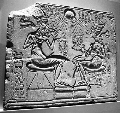 Ехнатон, жена му Нефертити и техните деца. Бог Атон е изобразен като слънчев диск, изливащ силата си към царското семейство.