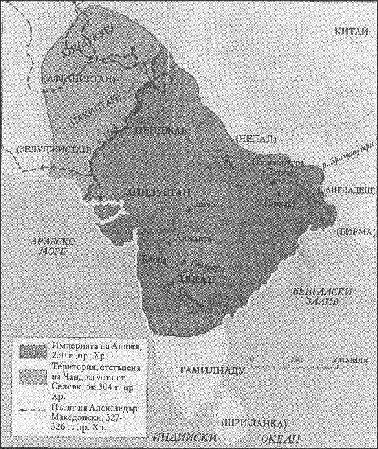В бунтовете и бъркотията, последвали смъртта на Александър в 323 г. пр.Хр., един индийски авантюрист на име Чандрагупта Маурия съзрял възможността да основе династия. Чандрагупта се възползвал от гръцката военна тактика и оглавил движението за изгонване на македонските чиновници от Индия. След това той обърнал армията си срещу царството Магадха, което по това време било най-силната държава в Хиндустан. Той разгромил и убил магадхския цар и се утвърдил като владетел със столица в Паталипутра (днес Патна), величествен град, дълъг 13 километра, господстващ над южния бряг на Ганг. Когато Селевк (наследникът на Александър в Сирия и Персия) се опитал да си върне загубената индийска територия, Чандрагупта му нанесъл тежко поражение и го принудил да отстъпи Белуджистан и част от Афганистан. Чандрагупта разширил властта си над по-голямата част от Северна Индия и основал първата империя в индийската история. Макар че династията му, наречена Маурия, траяла по-малко от век и половина, тя извършила забележителни дела.