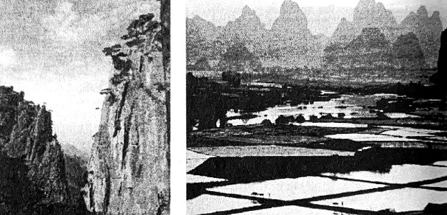 Китайски пейзажи. Вляво: Планините Хонгшан в провинция Анхуй, Централен Китай. Вдясно: Оризища край село Янгшу, провинция Гуанцзи. Главната форма на земеделие в Южен Китай е заливното.