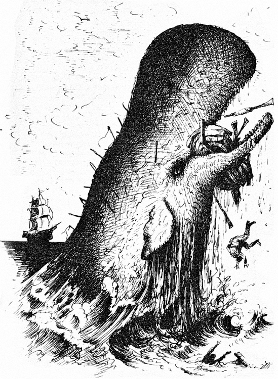 Насреща връхлиташе една жива грамада от месо, която се подхвърляше през вълните, надигнала още по-високи разбъркани вълни. По гърба й като чудовищен таралеж стърчаха забити двадесетина харпуна, начупени, разкривени, развели накъсаните си разнищени въжета.