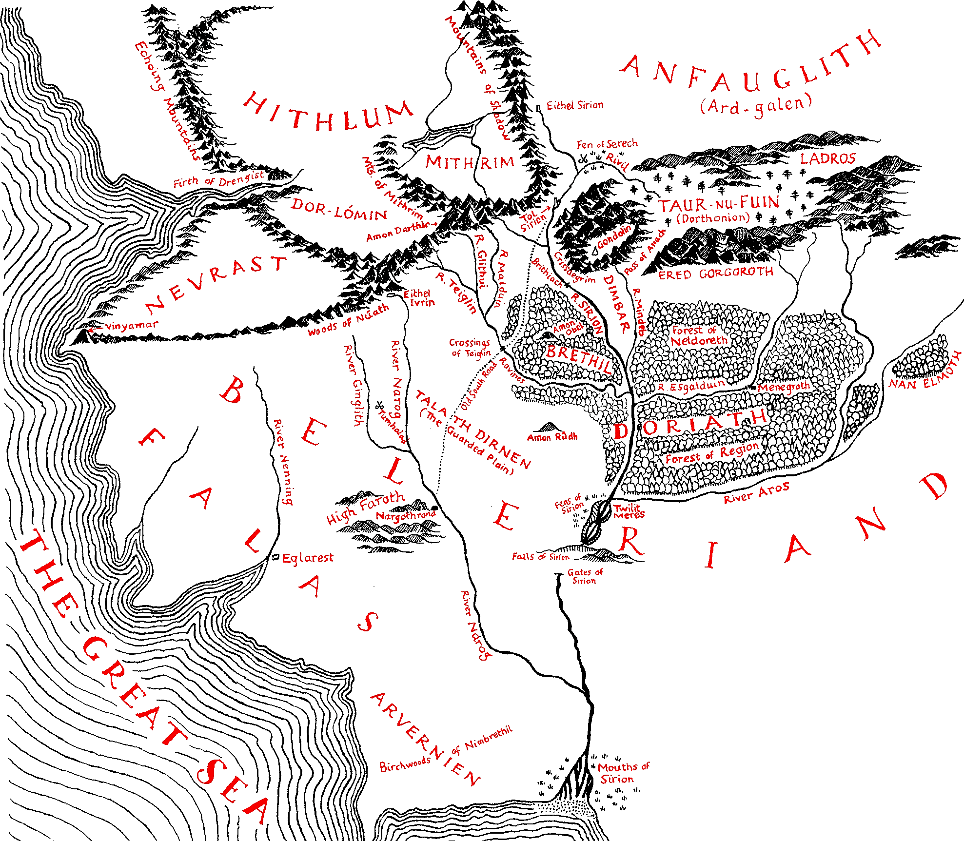 Тази карта се основава изцяло на публикуваната в „Силмарилион“, която пък е извлечена от картата, която баща ми създаде през 30-те години и повече не я промени, като я използваше за цялото си следващо творчество. Доста по-съкратеното представяне на планини, хълмове и гори тук копира неговия стил.