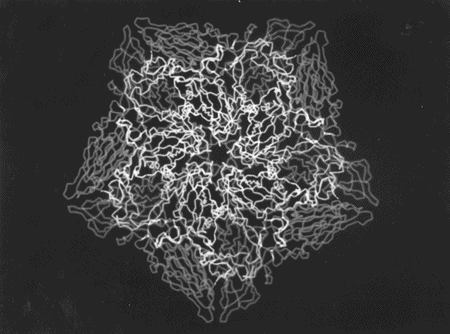 — Поради което се притекох на помощ. — Линдал избута с лакът Едмънд. — За да получа по-ясна картина, събрах данните за белтъка от молекулярния биолог на екипа. С тези данни и с помощта на програма, която съм патентовал, съставих триизмерен модел на капсидата, или външната обвивка на вириона.