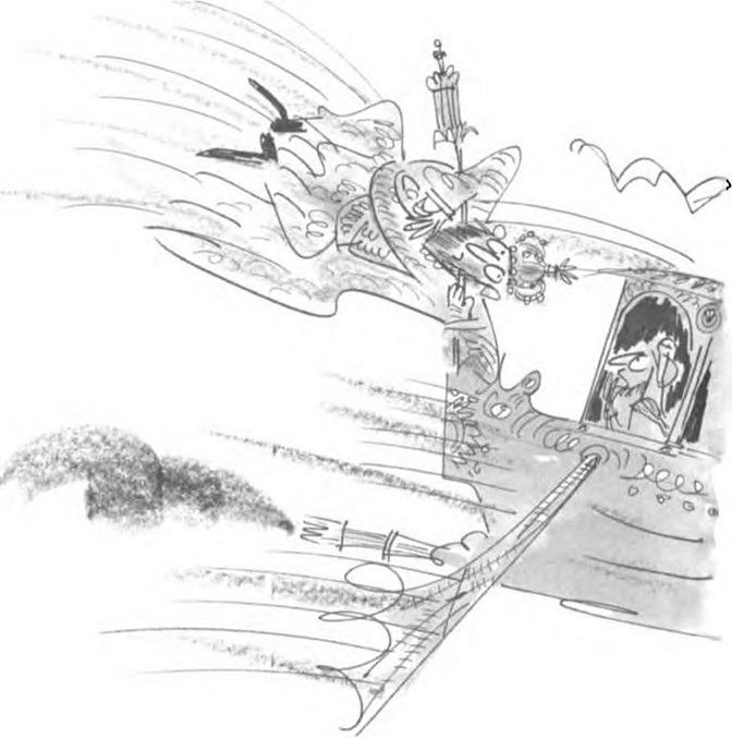 — Но как? — попита Гуимпър. Тъй като хората бяха съвсем мънички, те притежаваха естествената способност да се реят, но мъчното беше да се изстрелят, та да прелетят двата сантиметра. Най-сетне той построи нещо като покрита гребна лодка с два чифта криле и много дърворезба за украса.