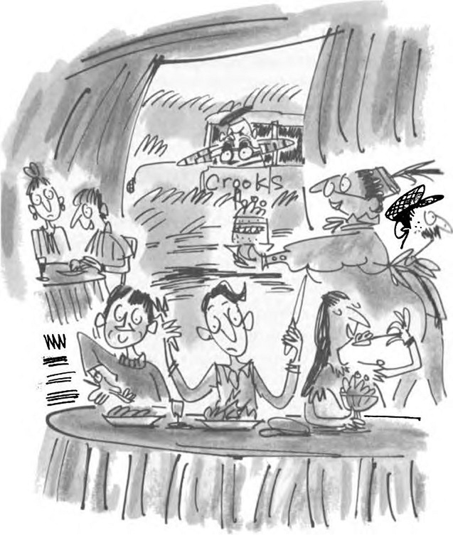 На няколкостотин метра оттам двама мошеници седяха в една стара лека кола и наблюдаваха ливадата през бинокъл. (Нали знаете, че на колите на полицаите с големи букви пише „полиция“. Е, на колата на мошениците имаше надпис с големи червени букви МОШЕНИЦИ — да не вземат да се сбъркат хората.)