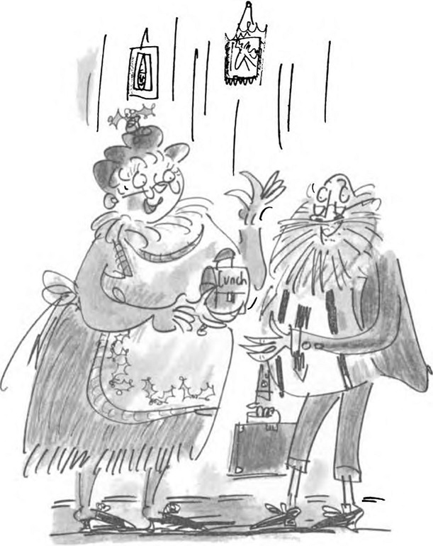 Дядо Коледа спеше непробудно на канапето, захлупил лицето си с вестник, и похъркваше. Госпожа Коледа седеше от другата страна на пламтящата камина, кърпеше му чорапите и мрънкаше.