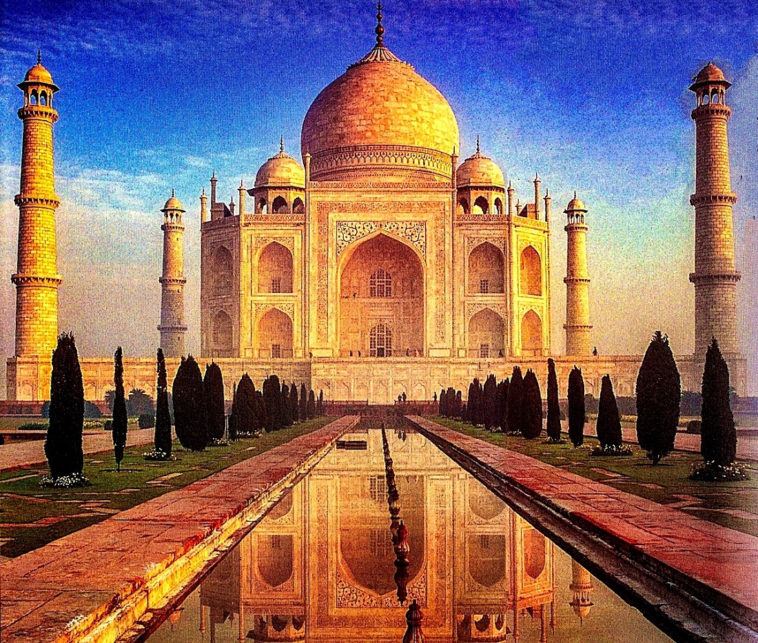 Тадж Махал е най-известният паметник на любовта, издиган досега. Според легендата е построен от моголския владетел Шах Джахан в изпълнение на обещанието, което дал в предсмъртния час на жена си Мумтаз Махал („избраница на двореца“). Тя му става съпруга, когато е на 14 години, и е най-любимата от трите му жени. Умира при раждане на 14-то им дете през 1631 г. Шахът се заклева, че ще й построи мавзолей, който няма равен на света. Майстори калиграфи, скулптори и каменоделци от цялата Моголска империя и отвъд границите й пристигат в столицата Агра. За украсата са използвани 28 различни вида скъпоценни камъни, докарани от Китай и Арабия. След 22 години строителство, в което участвали 20 000 работници и 1000 работни слона, невероятният Тадж Махал се превърнал във върхово постижение на моголската архитектура.
