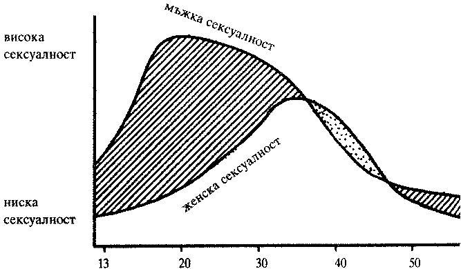 По-долу ви представяме една схема, отразяваща желанието за секс на средностатистическите мъже и жени през целия им живот. На нея не са отразени онези периоди от живота, когато желанието за секс може да бъде по-голямо или по-малко, в зависимост от различни фактори от обкръжението, като раждания, смърт, период на ухажване, пенсиониране и т. н. Графиката е нарочно опростена, защото целта й е просто да покаже най-общо разликите в мъжкото и женското желание за секс.