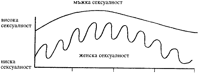 Разгледайте следващата графика, която ви даваме и проучете върховете и спадовете на женското полово желание в разстояние на една година. Върховете бележат моментите, когато има най-голяма вероятност жената да иска да постигне оргазъм — около времето на овулацията — а спадовете са в дните, когато й се иска повече гушкане и несексуални ласки.