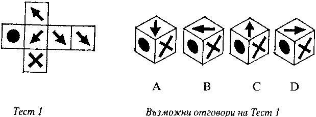 Представете си, че фигурата на Тест 7 е от картон. Ако я сгънете по свръзките, ще се получи куб с по един символ на всяка от външните стени. Като се знае, че страната с кръста е отдясно, а тази с кръга е отляво, кой от предложените варианти, според вас, отговаря на куба, който ще се получи при сгъването? Направете теста сега.